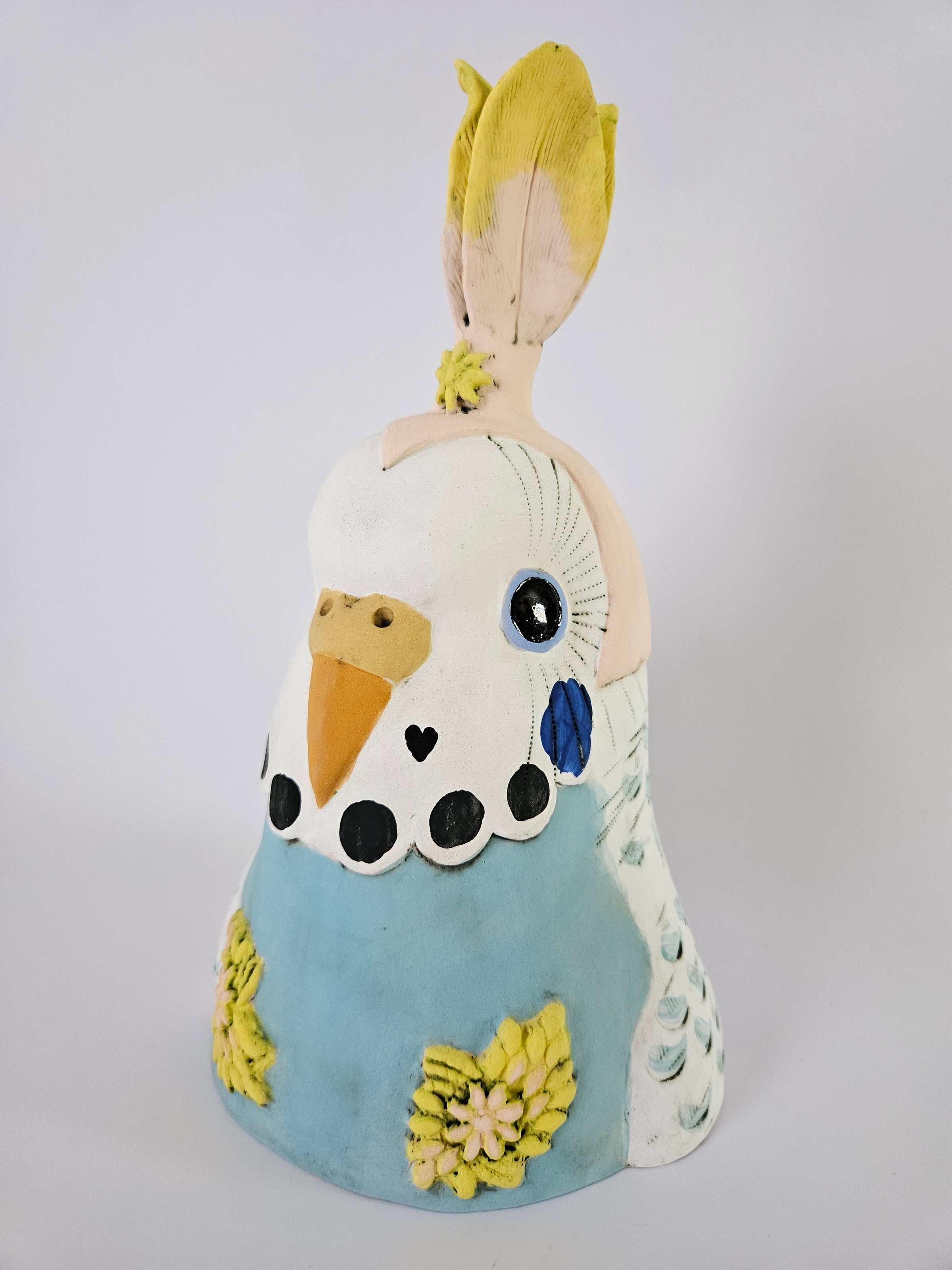 Meet Dita, Charlotte Miller's fabulous showgirl ceramic budgie sculpture! Stoneware body with underglaze and engobe decoration.