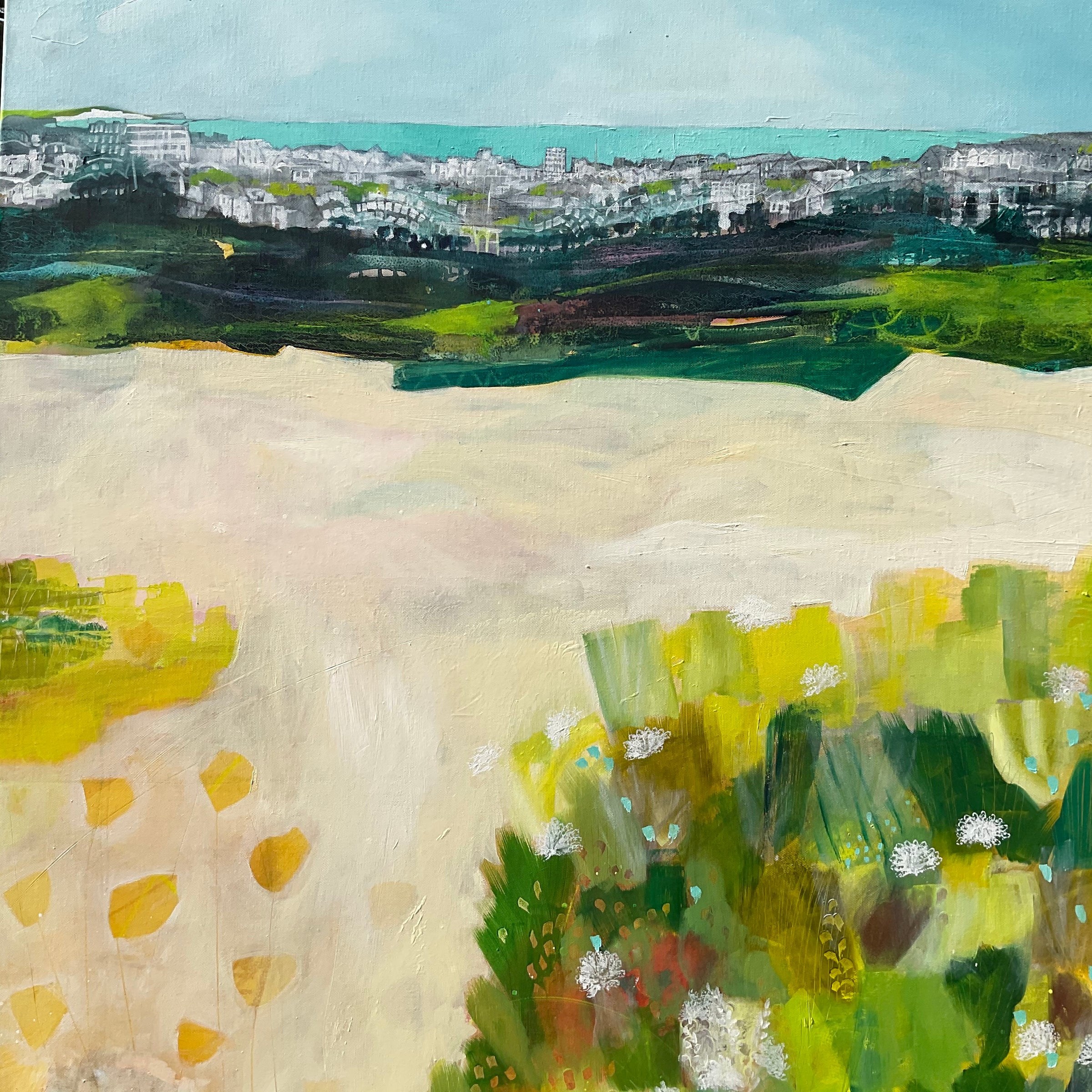 This new collection takes a fresh look at our wonderful coastline as seen from the South Downs. In this painting, we can see Brighton in the distance framed by a turquoise sea and a Summer sky with the white cliffs just in view to the left. The wild flowers are in full bloom.