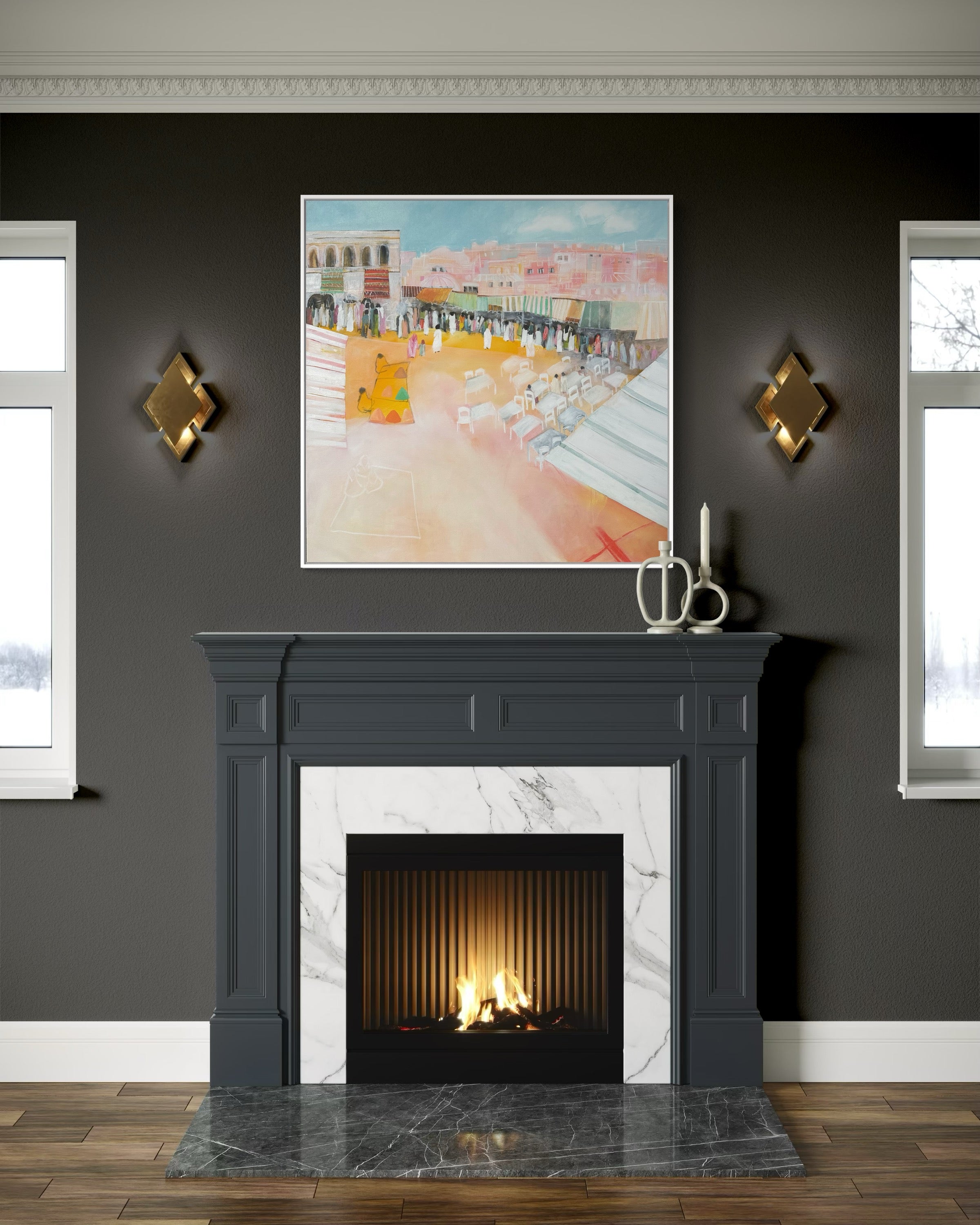 Market day in the Moroccan town of Essaouira attracting townsfolk and seagulls to the quayside. Inspired by a road trip through the High Atlas mountains and ending in this vibrant, coastal town with a very welcome swimming pool. Warm yellows and burnt orange tones provide a sense of space with the typical low, white houses in the background.