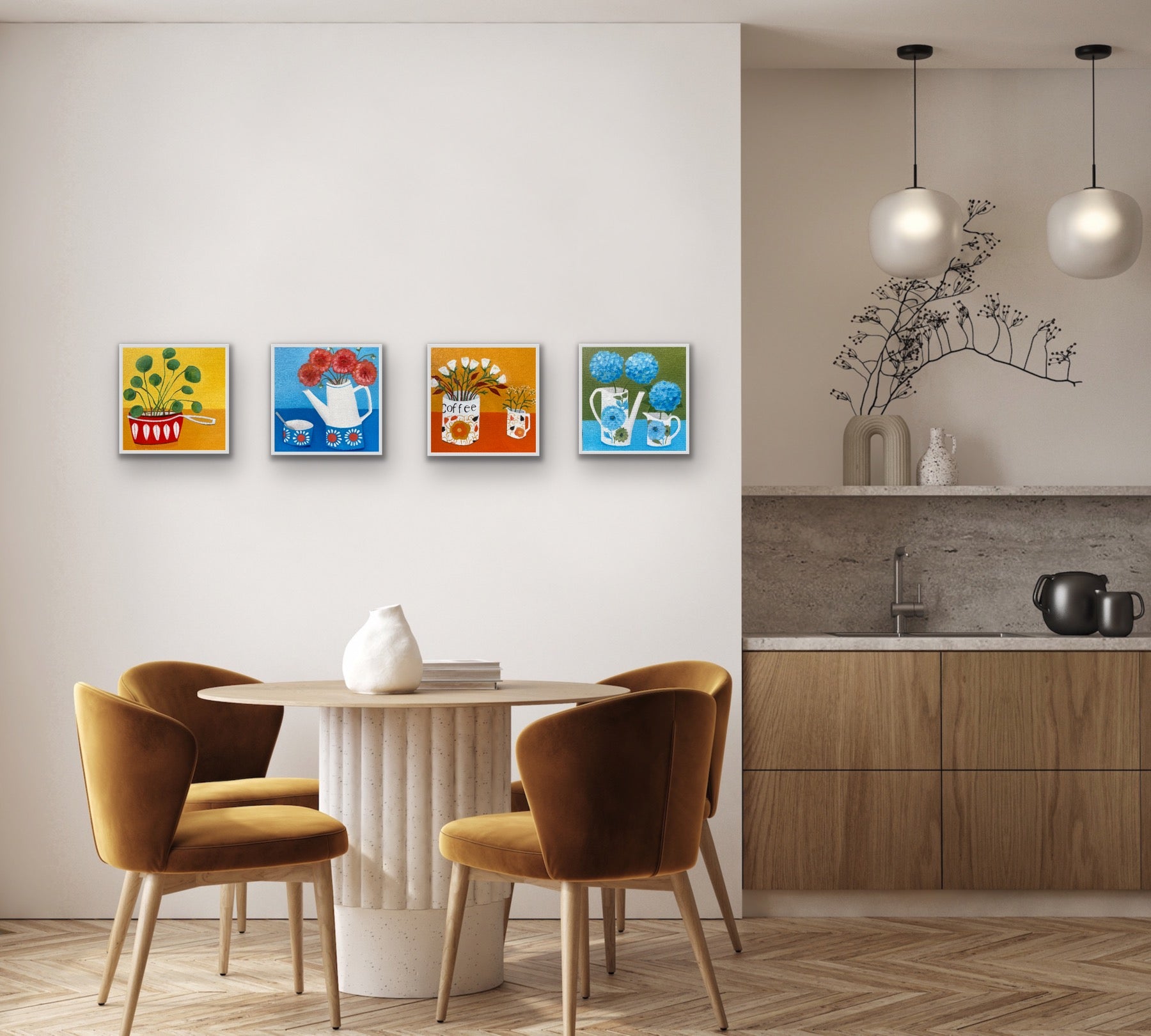 'Dahlias on Blue' is part of Katty's new vintage Tea set collection. This collection began while sheltering from torrential rain in an antiques center in Devon. Katty began sketching these wonderful vintage teas sets amongst other objects. We hope you enjoy these uplifting small still lives as much as she has painting them.