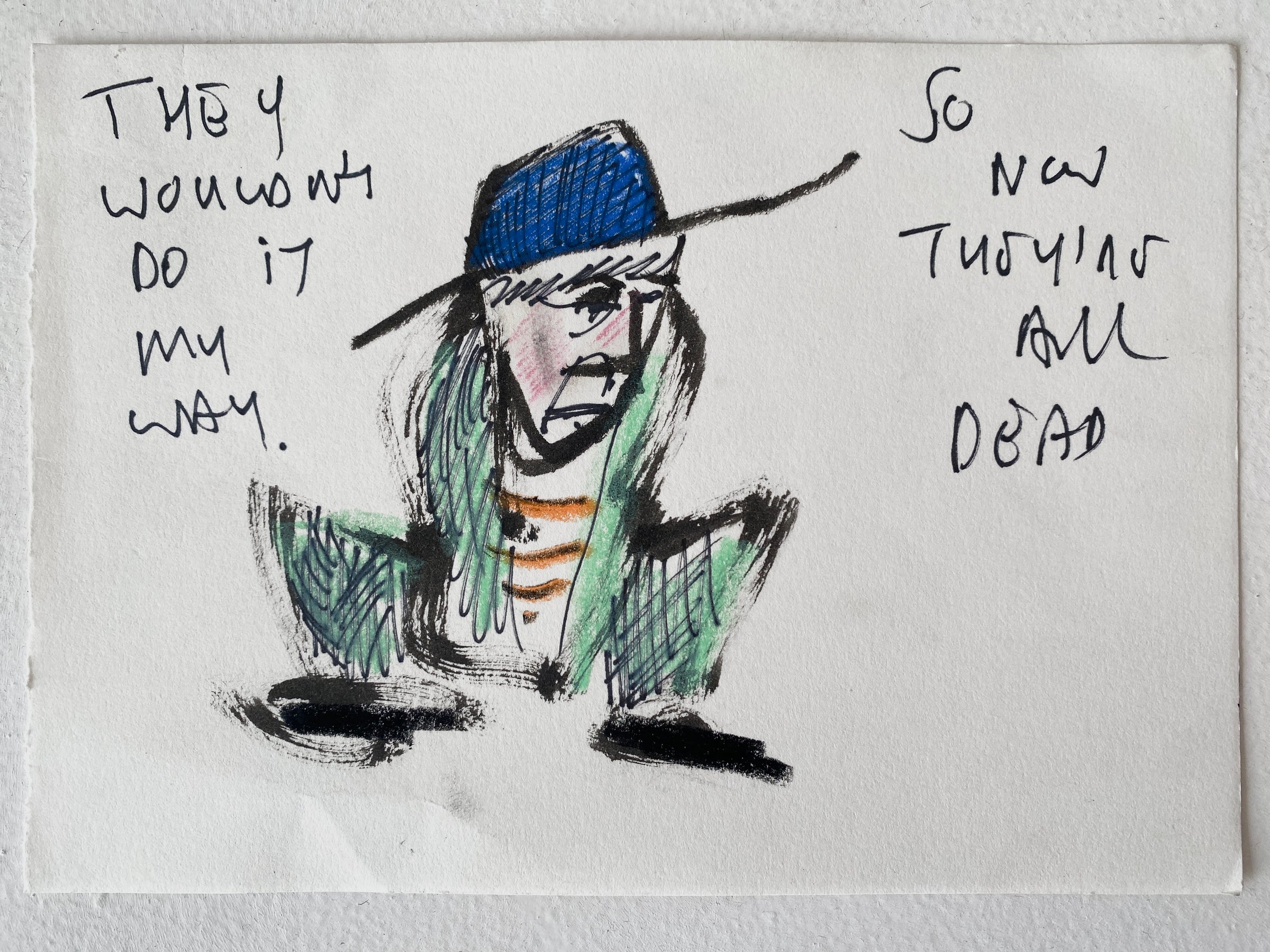 An UNFRAMED, signed, original sketchbook page directly from Dylan Moran’s well-travelled sketchbooks. Each artwork is in mixed media on paper. Some pages show signs of wear and creases. Please zoom in to the photos .