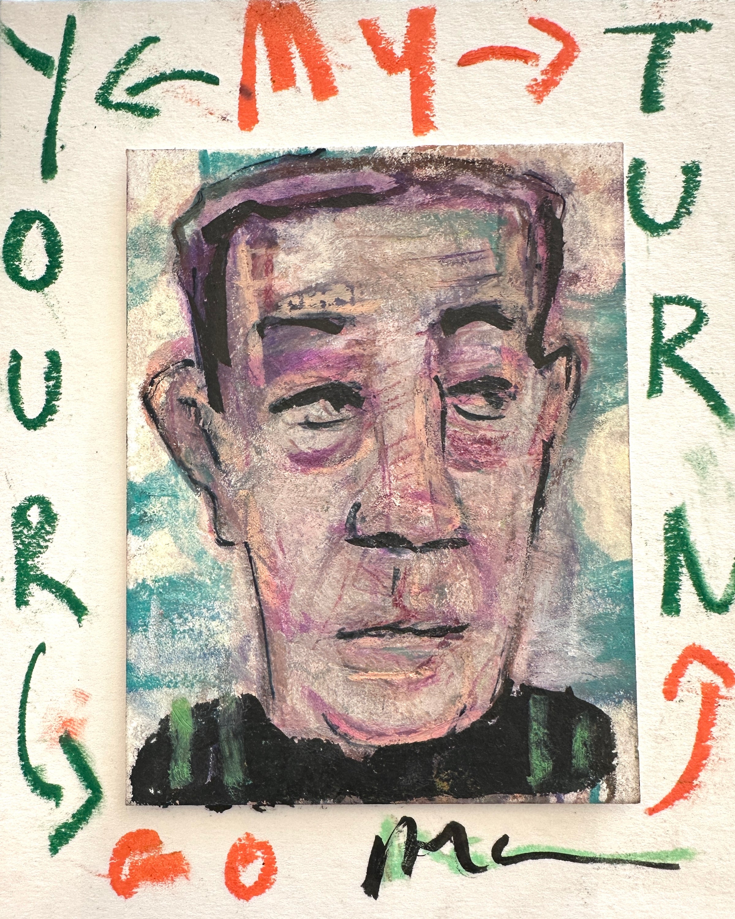 Characterful portraits on heavyweight art paper in mixed media mounted on card with writing. Signed on the front.