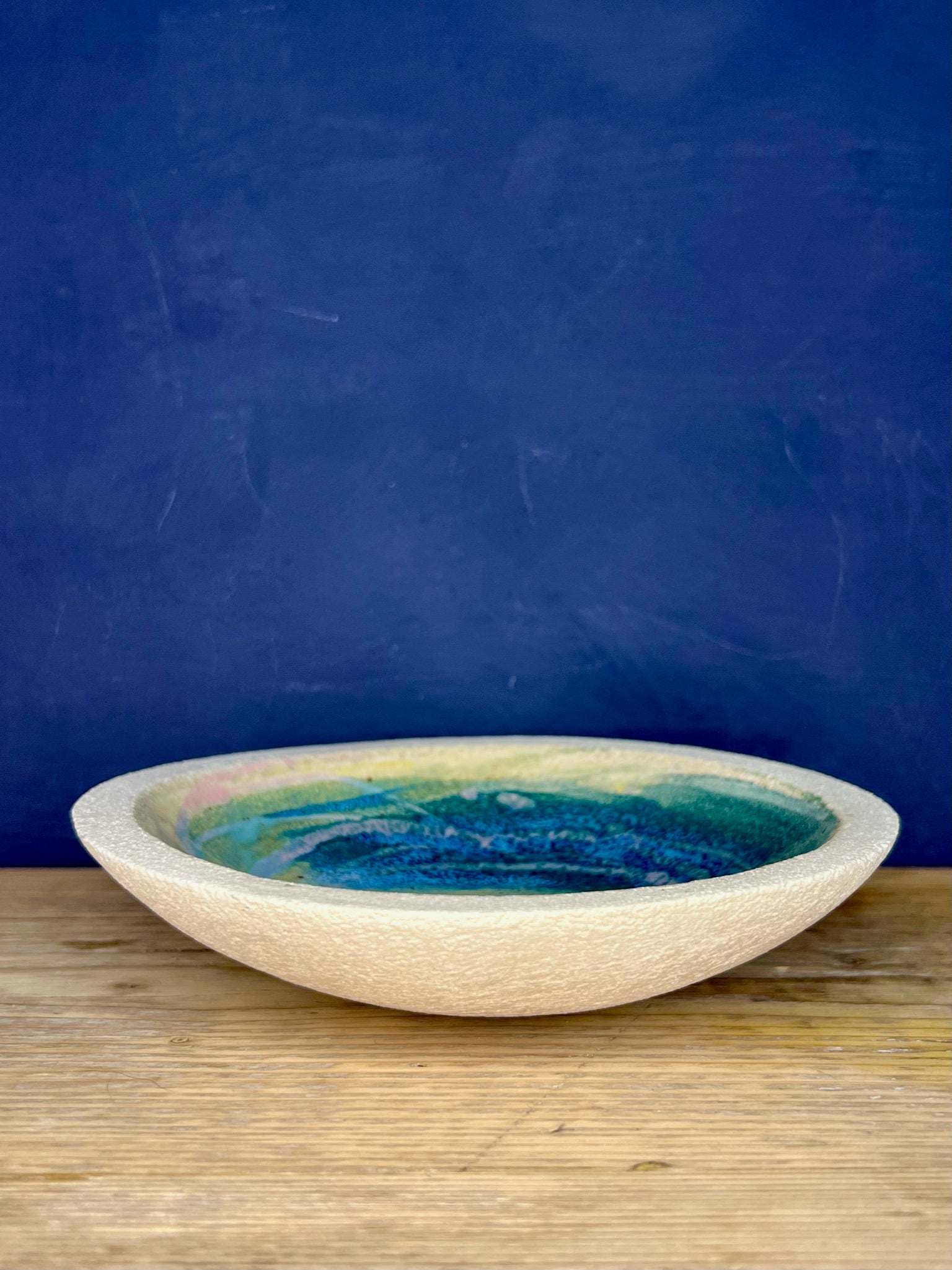 Chunky white stoneware, whirlpool glazed interior; raw exterior Approx 18cm diameter x 4cm |