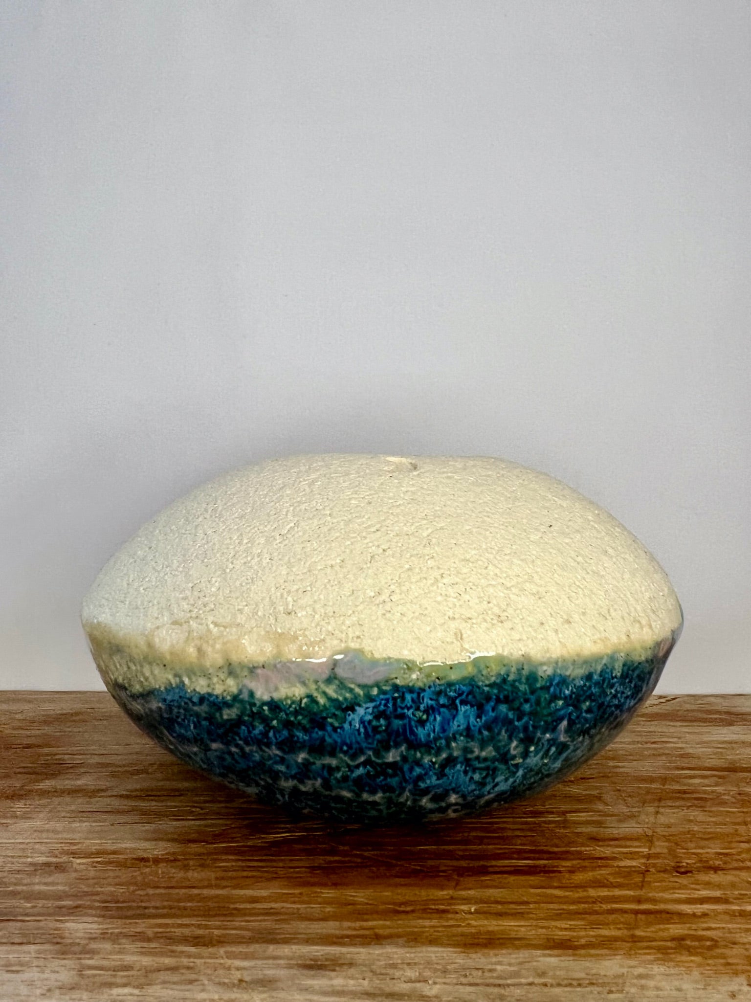 Fat discus pot, half glazed in fluid marine swirl Approx 14cm diameter x 7cm |