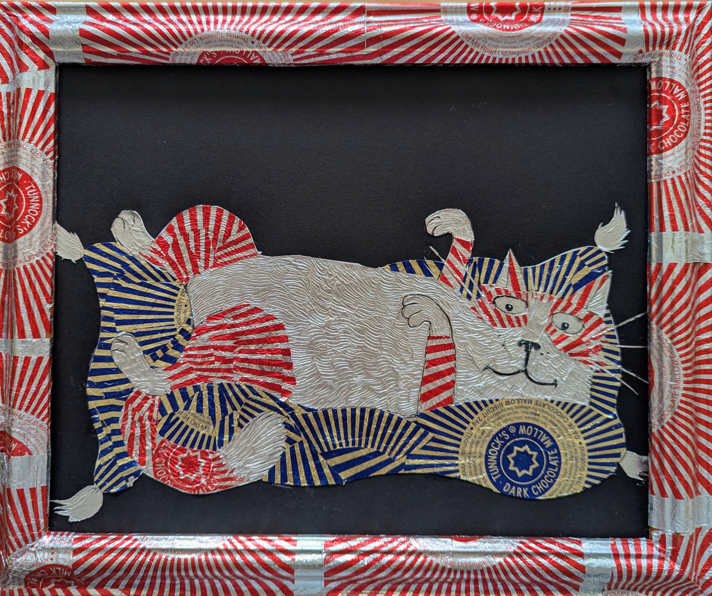 Made from blue and red Tunnock's Teacake foils and framed in a bespoke Teacake frame (with glass)