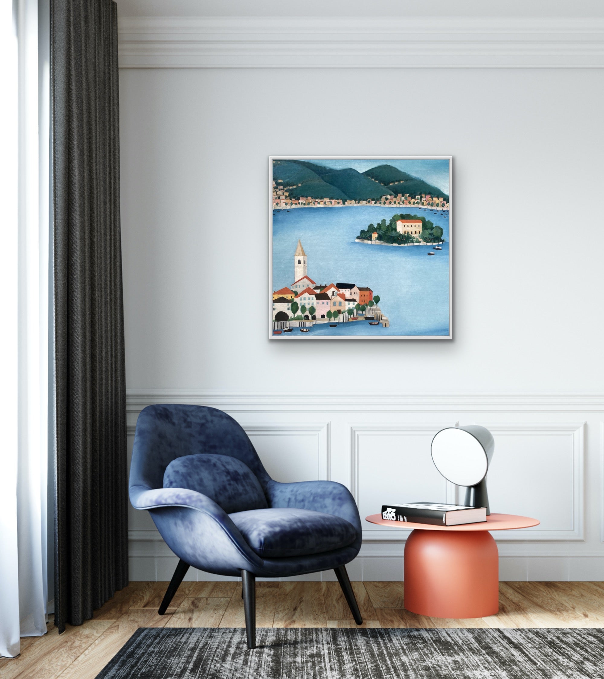 This painting is oil on linen , framed by the Ingo Fincke gallery in Battersea. Please allow approx 2cm each side to the 80cm x 80 cm canvas size.