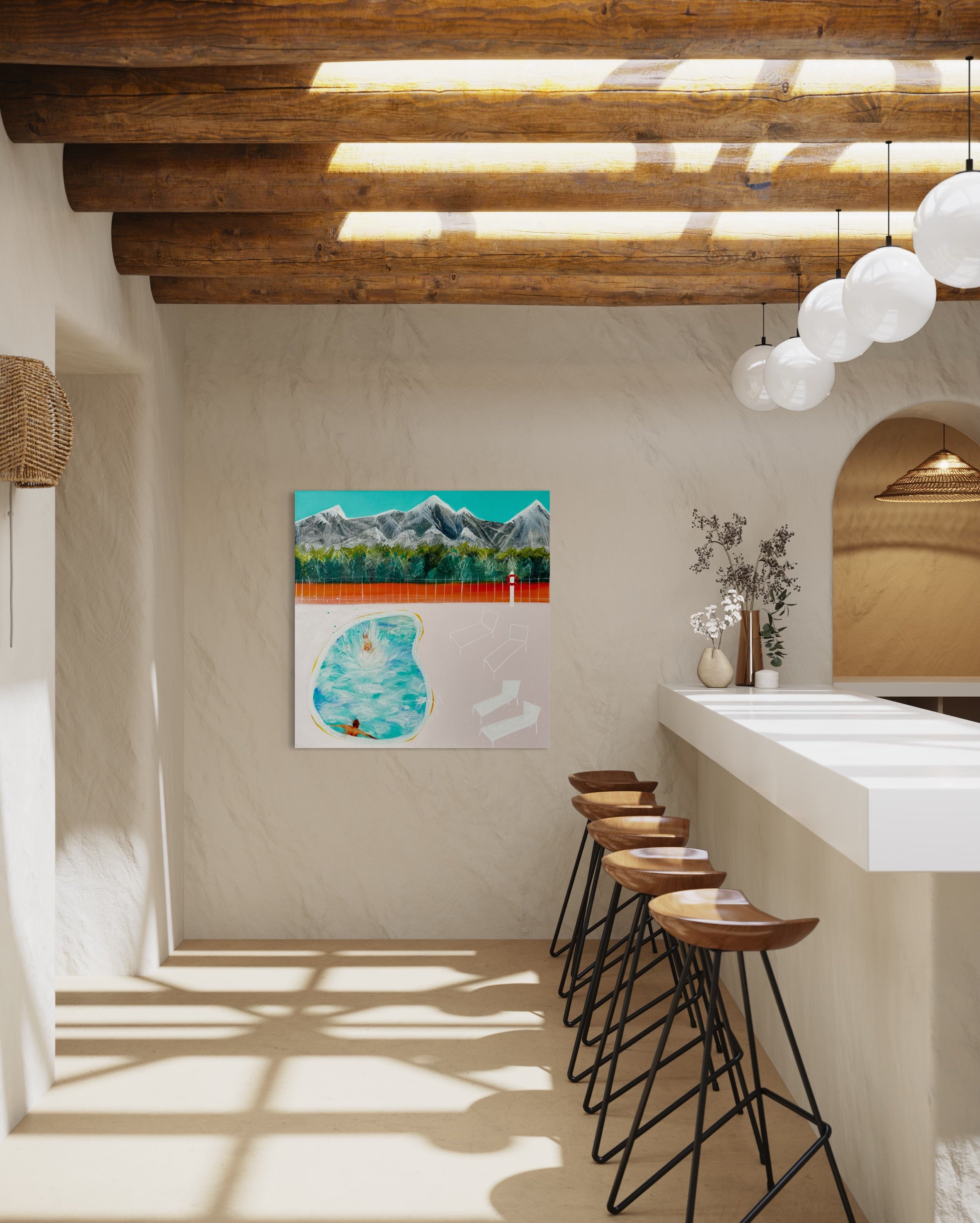 She fell in love with the vast landscapes, snow-capped mountains and the slow moving container ships in English Bay. This pool painting collection hopes to capture the cool fresh, air of swimming in the sun with the snowy mountain peaks beyond as well as a sense of calm and freedom.
