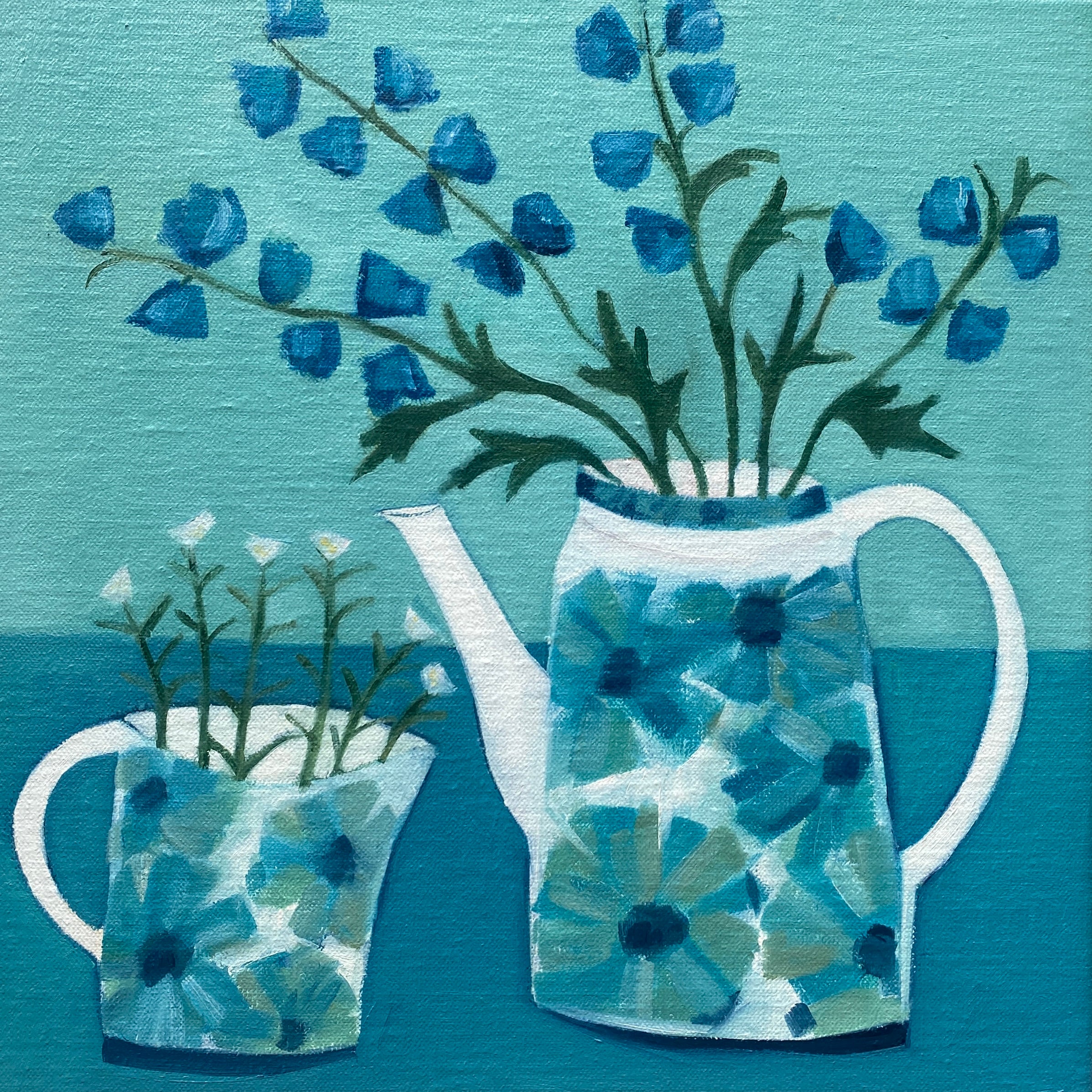 'Whites on Blues’ is part of Katty's new vintage Tea set collection. This collection began while sheltering from torrential rain in an antiques center in Devon. Katty began sketching these wonderful vintage teas sets amongst other objects. We hope you enjoy these uplifting small still lives as much as she has painting them.
